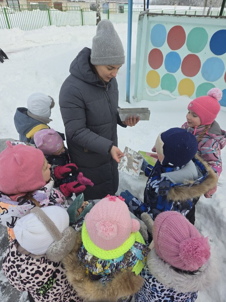 Яна Сергеевна рассказала детям, чем можно угощать птиц зимой. Для воробьёв и снегирей в кормушки кладут пшено, семена подсолнечника, орехи и ягоды рябины. Синички любят несолёное сало и семечки, поэтому для них на кустах развешивают кусочки сала — это помогает маленьким птичкам согреться и набраться сил. Голубям и голубкам можно подсыпать зерно и хлебные крошки. Так каждый вид птиц получили своё угощение, а ребята учились заботиться о живых существах правильно.